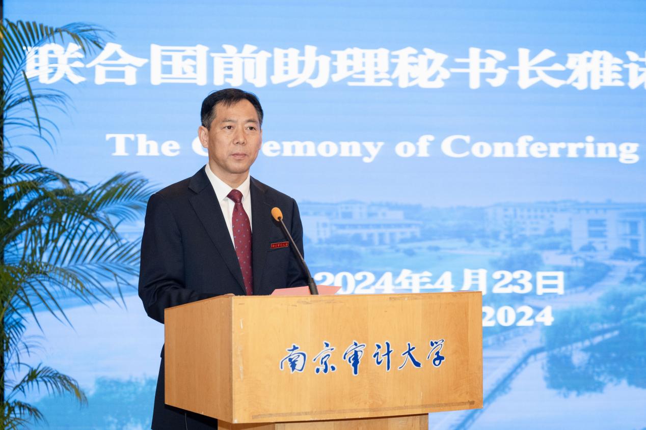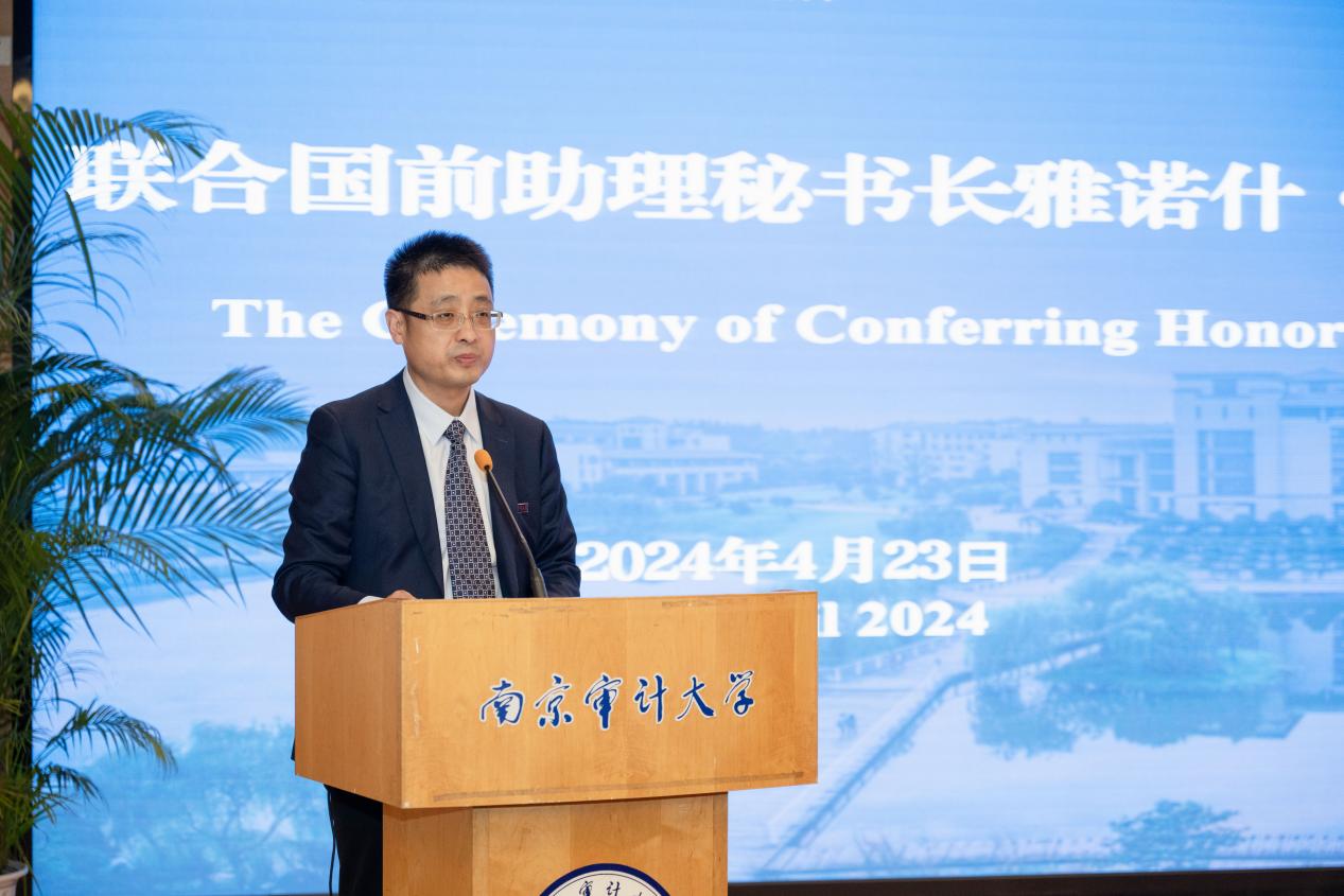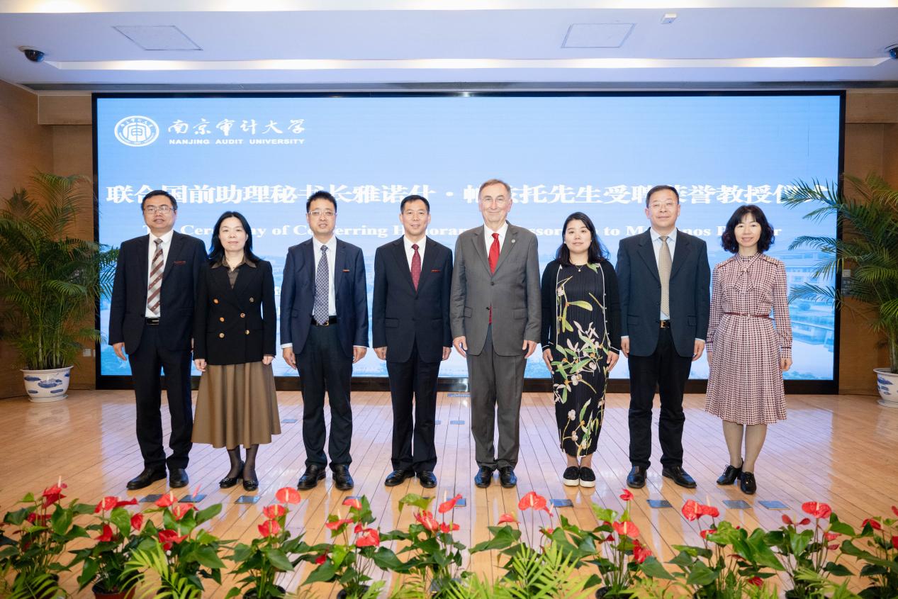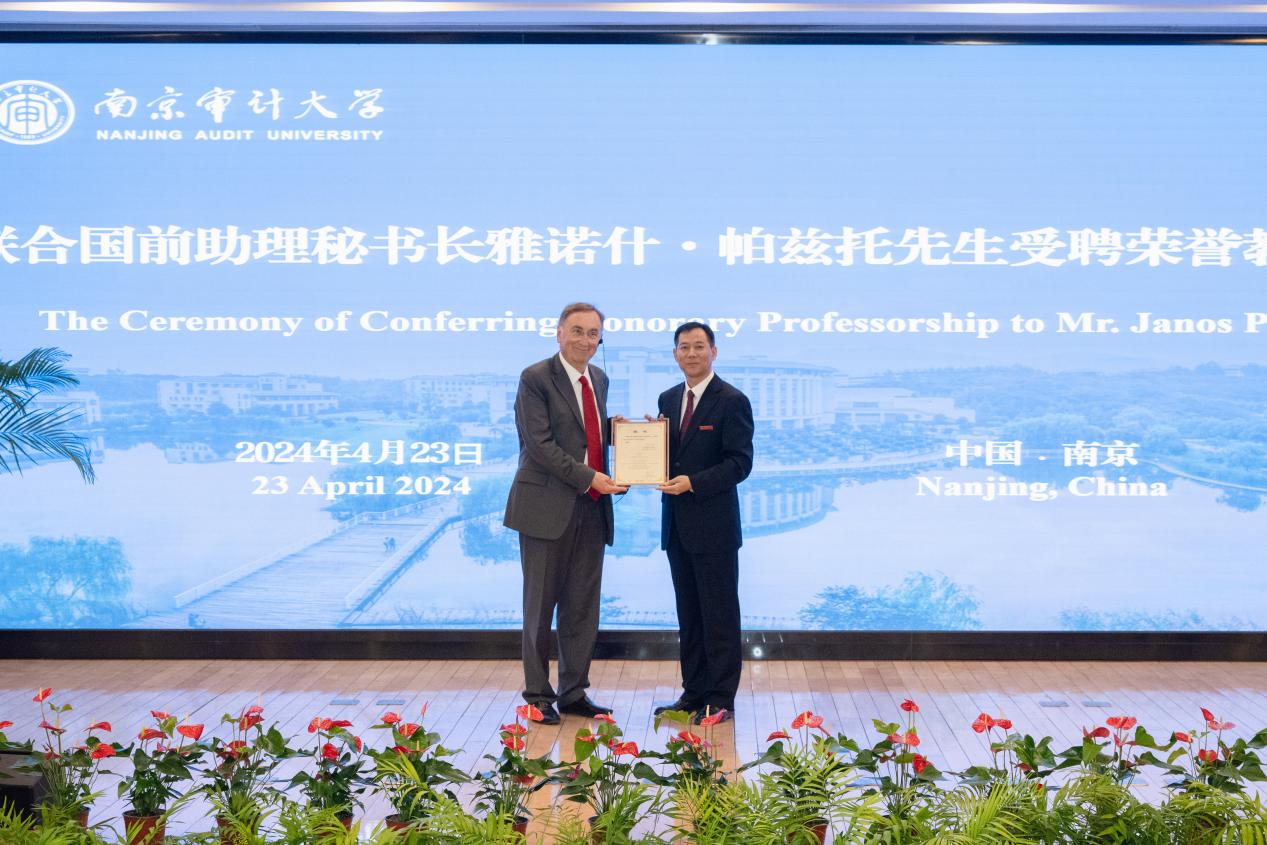 4月23日,聯(lián)合國(guó)前助理秘書(shū)長(zhǎng)雅諾什·帕茲托受聘南京審計(jì)大學(xué)榮譽(yù)教授儀式暨演講會(huì)在敏達(dá)學(xué)術(shù)報(bào)告廳舉行。聯(lián)合國(guó)前助理秘書(shū)長(zhǎng)雅諾什·帕茲托,歐盟亞洲中心教務(wù)委員會(huì)主任高玲,南京審計(jì)大學(xué)校長(zhǎng)董必榮出席受聘儀式,相關(guān)部門(mén)負(fù)責(zé)人及師生代表參加。副校長(zhǎng)李乾文主持聘任儀式。