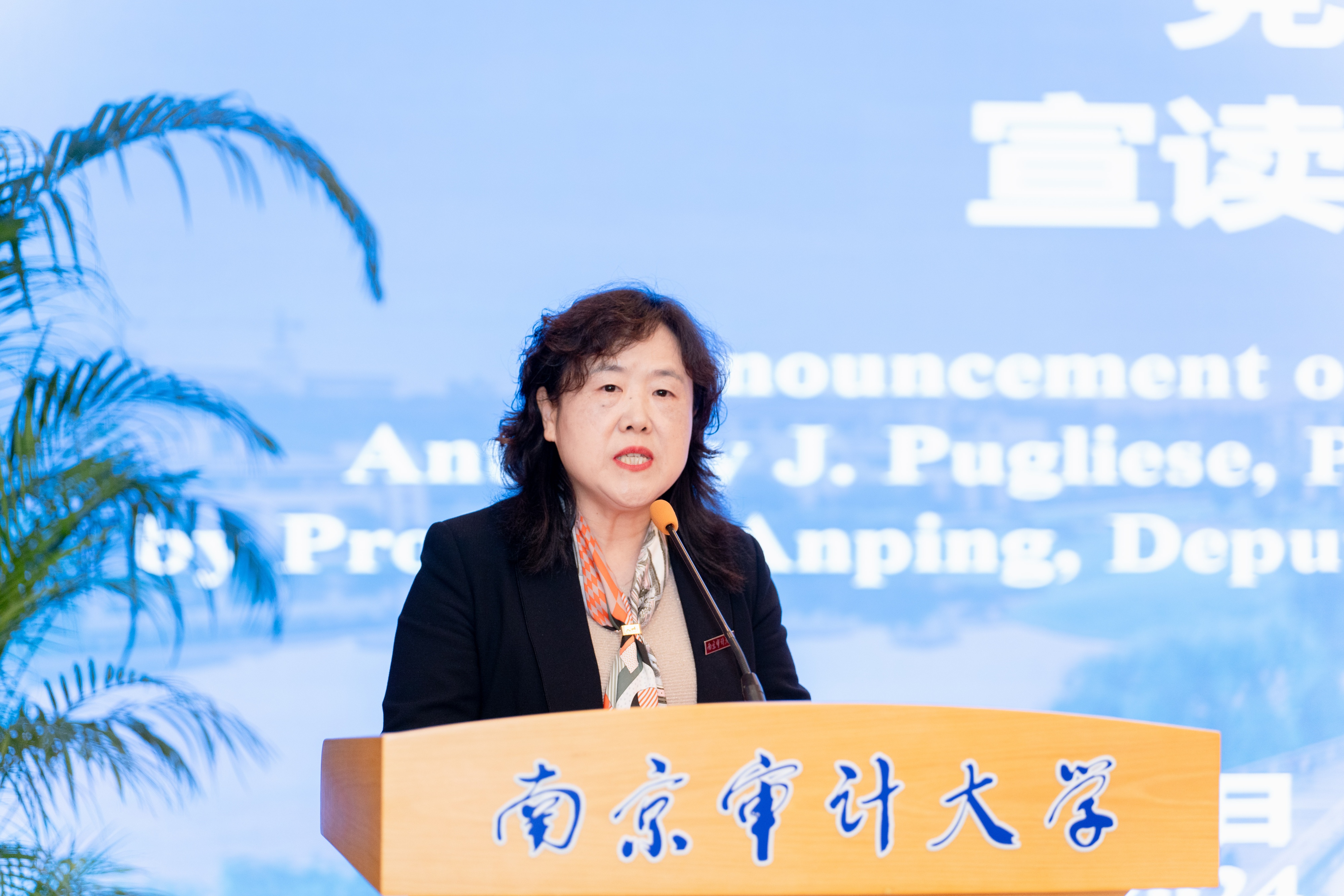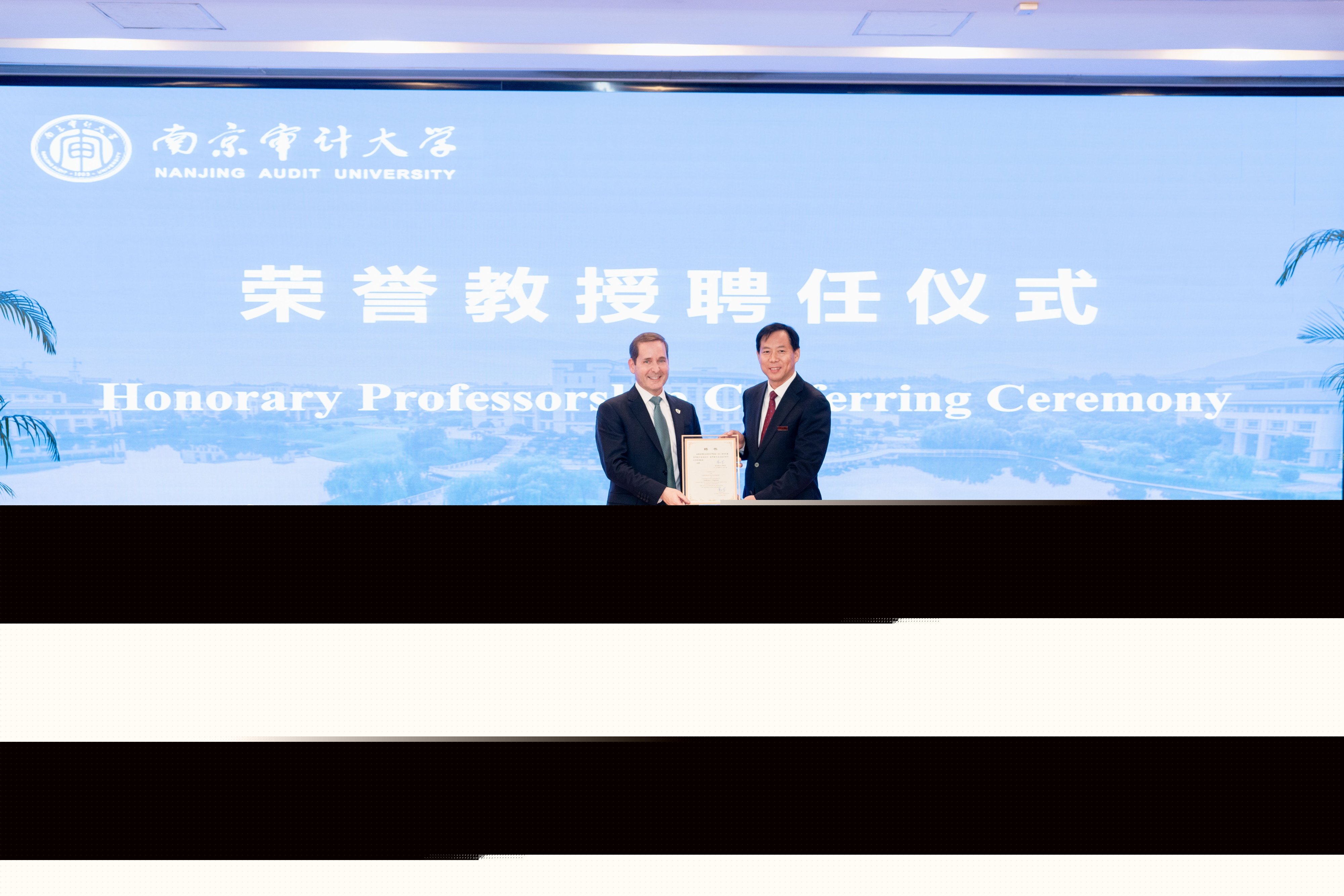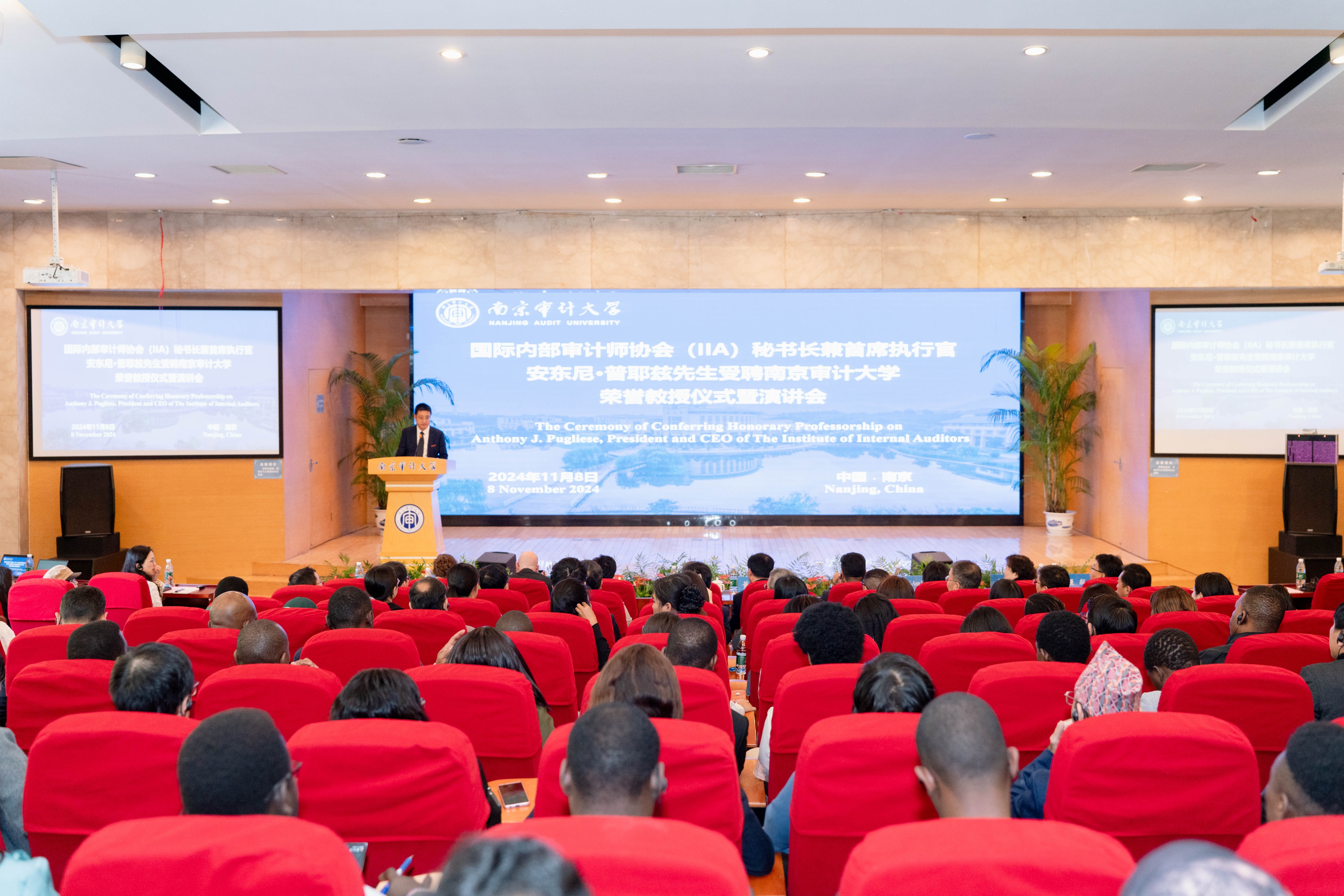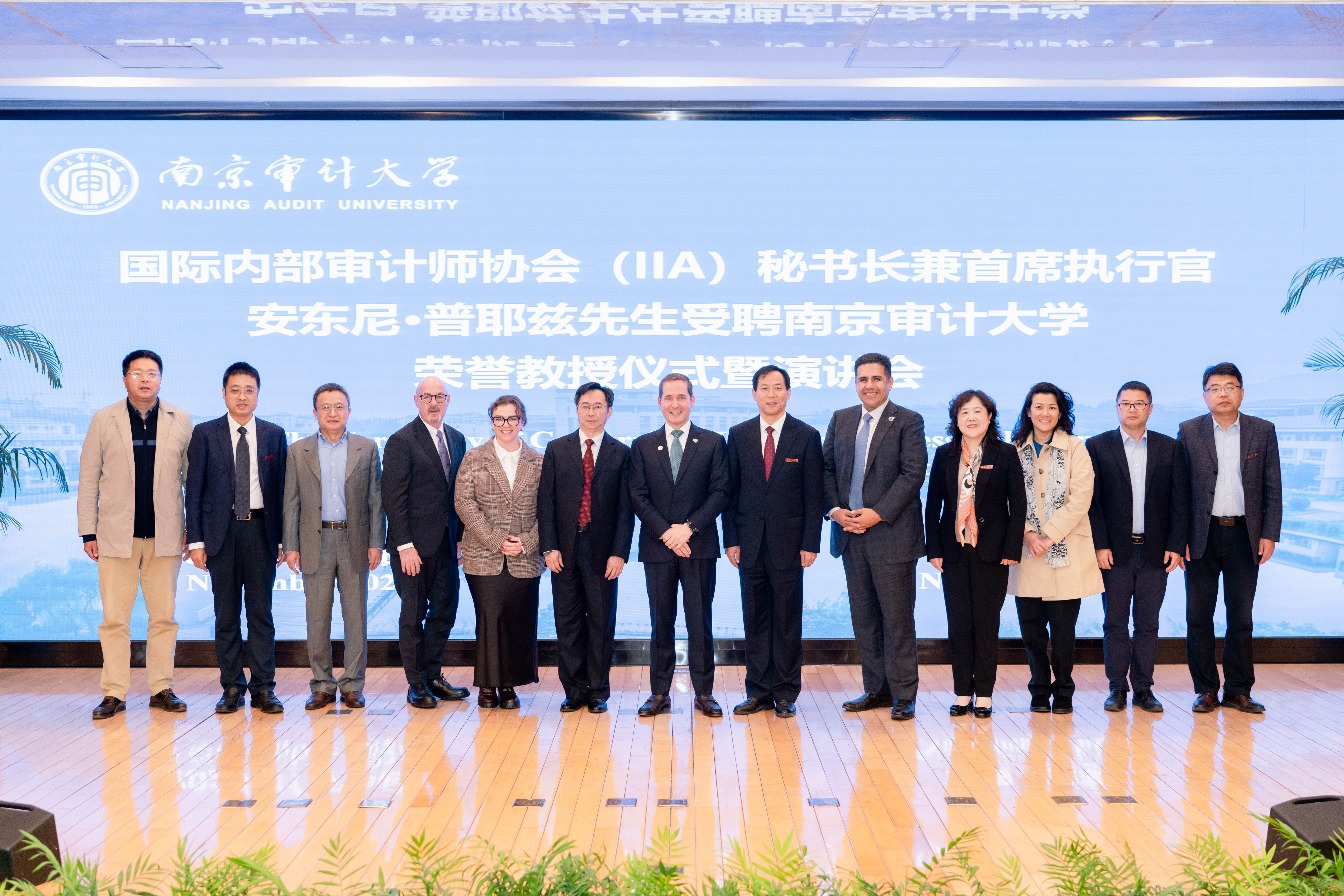 今天,國際內(nèi)部審計(jì)師協(xié)會(huì)秘書長兼首席執(zhí)行官安東尼·普耶茲先生受聘南京審計(jì)大學(xué)榮譽(yù)教授儀式暨演講會(huì)在敏達(dá)學(xué)術(shù)報(bào)告廳舉行。國際內(nèi)部審計(jì)師協(xié)會(huì)、中國內(nèi)部審計(jì)協(xié)會(huì)相關(guān)負(fù)責(zé)人,我校黨委書記、校長董必榮,黨委常委、副校長盧亞娟等出席聘任儀式,相關(guān)部門負(fù)責(zé)人及師生代表參加。黨委常委、副校長李乾文主持儀式。