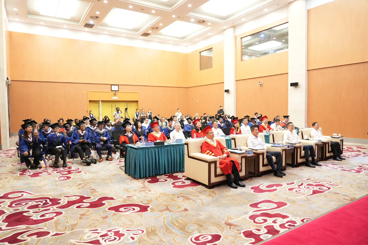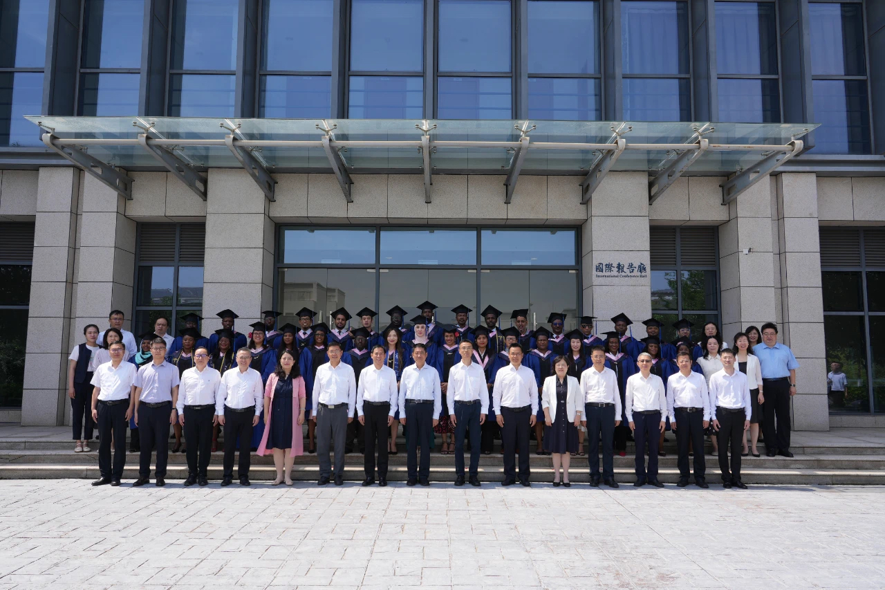 姜海鷹為獲得“優(yōu)秀畢業(yè)研究生”的留學生頒獎。南京審計大學學位評定委員會副主席、副校長姜海教授宣讀了畢業(yè)及學位授予決定。副校長李乾文教授宣讀了“審計長獎學金”和“優(yōu)秀畢業(yè)研究生”獲得者名單。隨后,校學位評定委員會主席、副主席和委員代表為畢業(yè)生撥穗并頒發(fā)學位證書。導師代表徐志耀教授回顧了留學生的成長故事,稱贊他們求學探索的精神與日俱增,鼓勵全體留學生學成回國后,將中國經(jīng)驗帶回母國去,讓中國智慧在世界各地生根發(fā)芽。