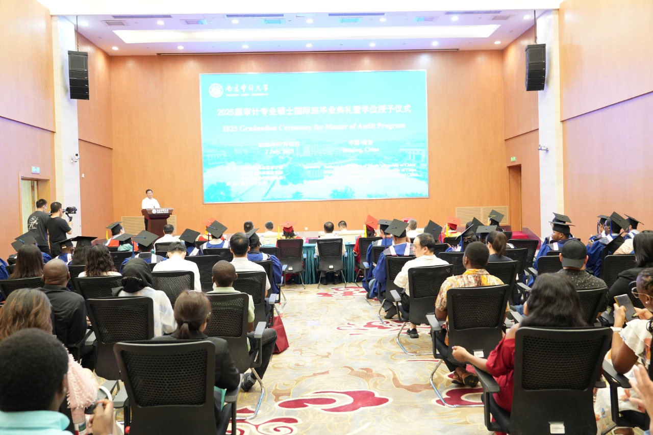 7月2日上午,南京審計大學2025屆審計專業(yè)碩士國際班畢業(yè)典禮暨學位授予儀式在審計署審計干部教育學院國際報告廳舉行。審計署黨組成員、中央經(jīng)濟責任審計工作部際聯(lián)席會議辦公室主任張俊,國際合作司司長姜海鷹,南京審計大學黨委書記董必榮,黨委副書記、校長陸華良等領導出席典禮。董必榮主持儀式。