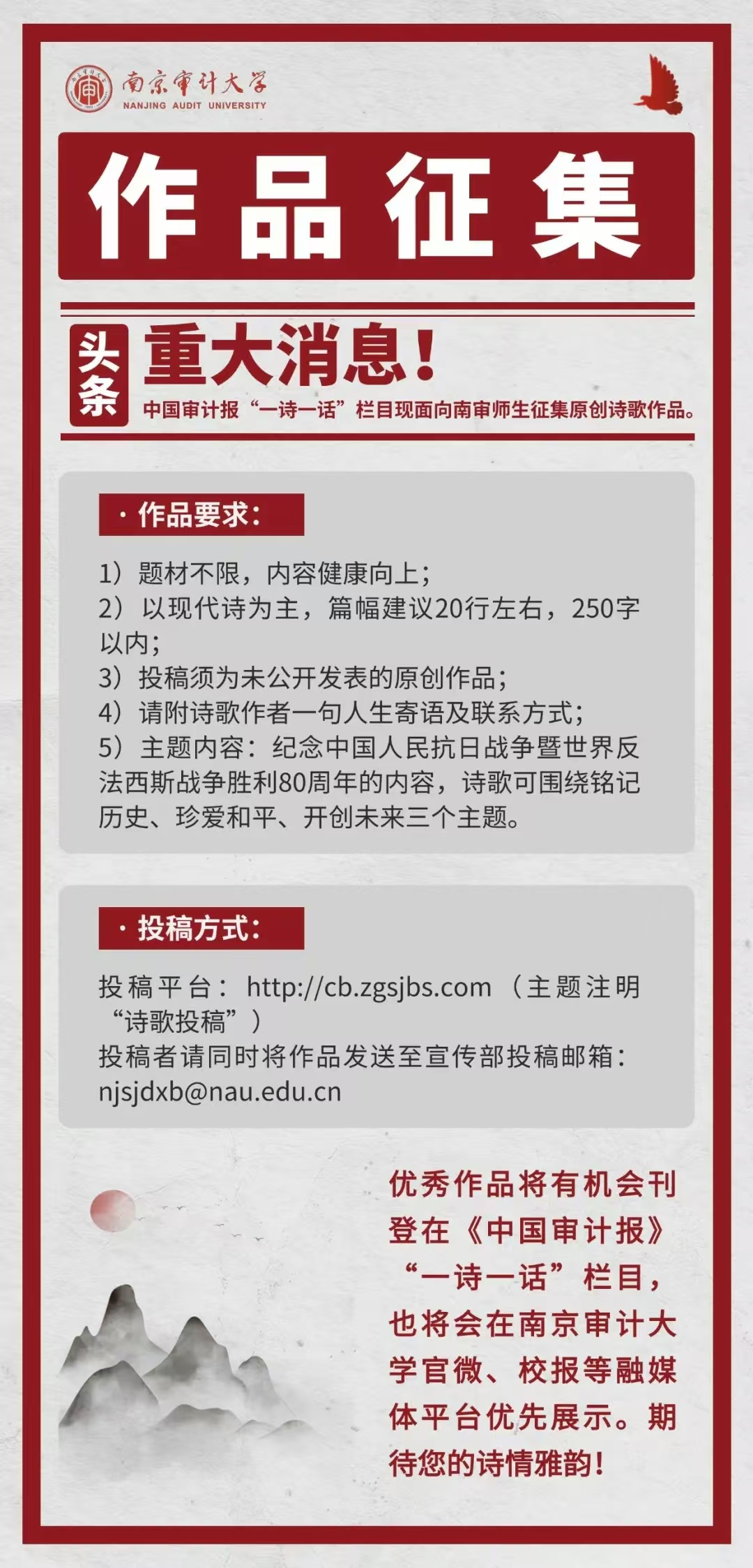 為紀(jì)念中國人民抗日戰(zhàn)爭暨世界反法西斯戰(zhàn)爭勝利80周年,中國審計(jì)報(bào)“一詩一話”欄目現(xiàn)面向南審師生征集原創(chuàng)詩歌作品~我們誠邀您圍繞 “銘記歷史、珍愛和平、開創(chuàng)未來” 三大主題,用詩行鐫刻民族記憶,抒發(fā)時(shí)代心聲!