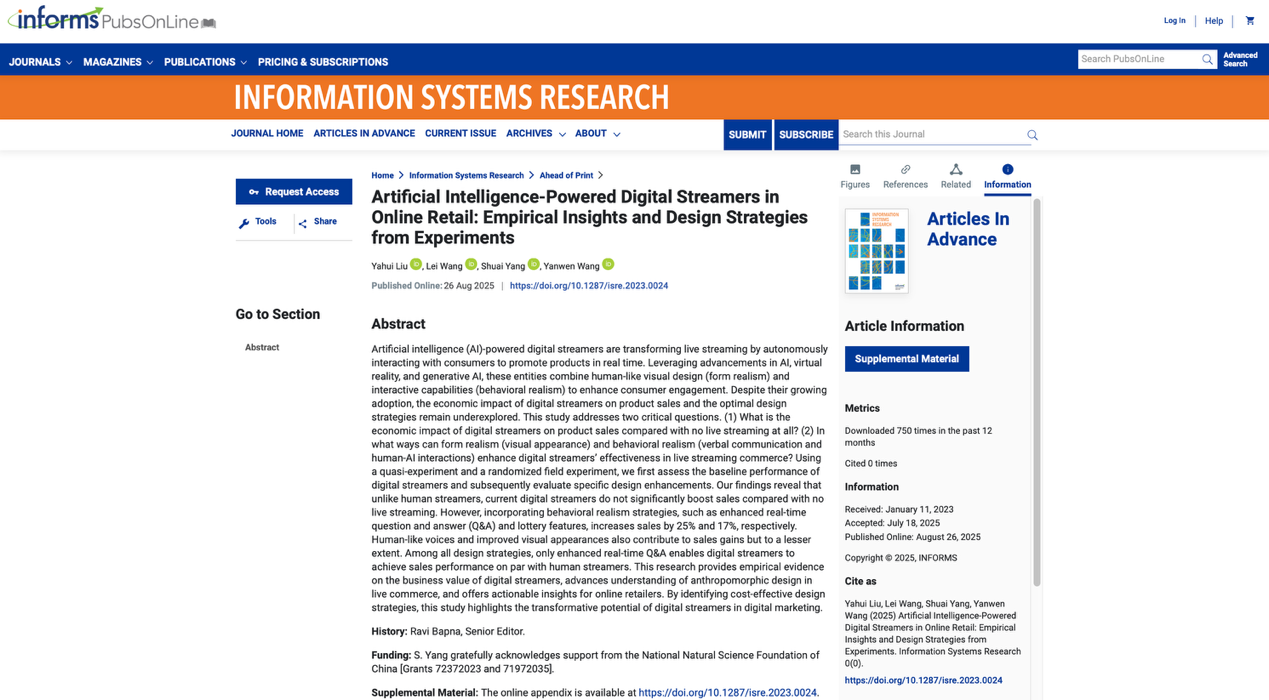 近日,我校商學院教師劉亞慧與Lei Wang教授(Indiana University)、楊帥教授(東華大學)、及Yanwen Wang教授(University of British Columbia)合作的《Artificial Intelligence-Powered Digital Streamers in Online Retail: Empirical Insights and Design Strategies from Experiments》在線發(fā)表于《Information Systems Research》。