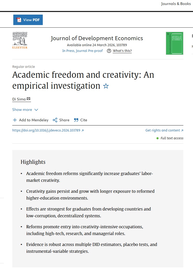 近日,我校教師司馬帝的獨(dú)作論文“Academic freedom and creativity: An empirical investigation”在國(guó)際期刊Journal of Development Economics上發(fā)表。