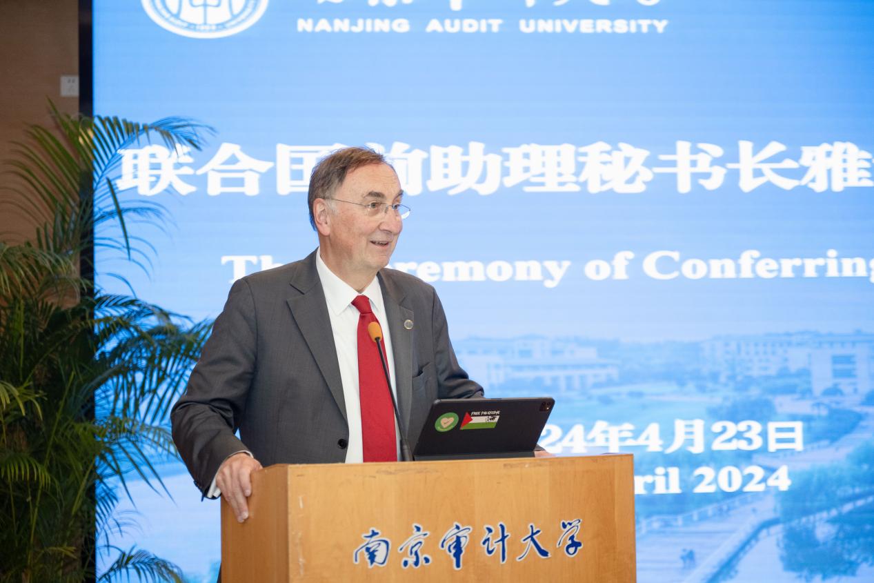 4月23日,聯(lián)合國前助理秘書長雅諾什·帕茲托受聘南京審計(jì)大學(xué)榮譽(yù)教授儀式暨演講會在敏達(dá)學(xué)術(shù)報(bào)告廳舉行。聯(lián)合國前助理秘書長雅諾什·帕茲托,歐盟亞洲中心教務(wù)委員會主任高玲,南京審計(jì)大學(xué)校長董必榮出席受聘儀式,相關(guān)部門負(fù)責(zé)人及師生代表參加。副校長李乾文主持聘任儀式。