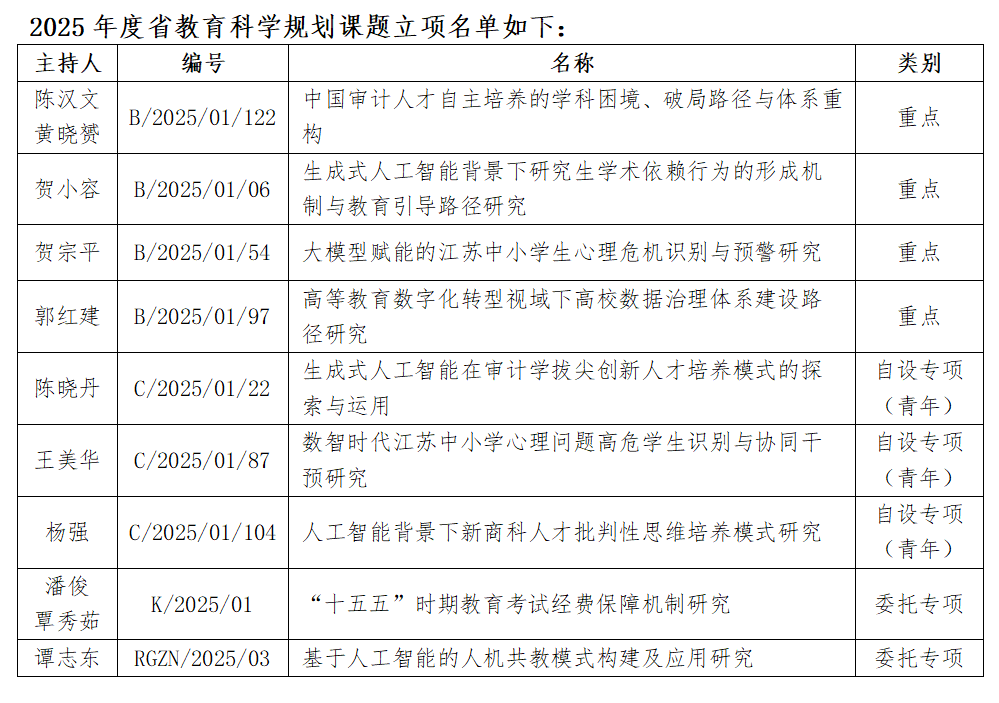 本次立項(xiàng)課題的研究范圍多集中于審計(jì)特色、高等教育治理、人才培養(yǎng)模式創(chuàng)新等優(yōu)勢領(lǐng)域,體現(xiàn)了我校教育科研服務(wù)國家戰(zhàn)略需求與學(xué)校中心工作的鮮明導(dǎo)向。