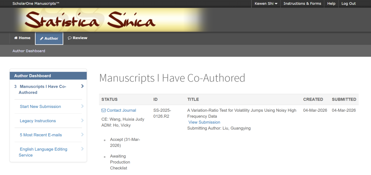 近日,我校統(tǒng)計與數(shù)據(jù)科學學院博士生施科文完成的學術(shù)論文“A Variation-Ratio Test for Volatility Jumps Using Noisy High Frequency Data”以南京審計大學為第一署名單位被統(tǒng)計學權(quán)威期刊Statistica Sinica接收。論文指導教師為我校統(tǒng)計與數(shù)據(jù)科學學院劉廣應(yīng)教授與上海財經(jīng)大學張志遠副教授。